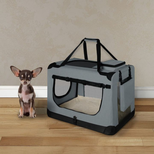 Skladací prepravný box pre psov, sivý, s posteľou, veľkosť S