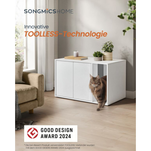 Montáž trvá len pár minút bez použitia náradia vďaka inovatívnym spojovacím prvkom. Skriňa je vyrobená z vysoko kvalitnej drevotrieskovej dosky a MDF, čo zaručuje pevnosť a odolnosť. Priestranný interiér je vhodný aj pre väčšie mačky a je ľahko čistiteľný a udržiavateľný.