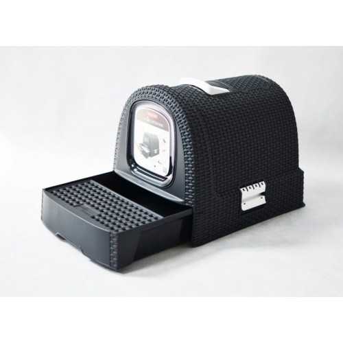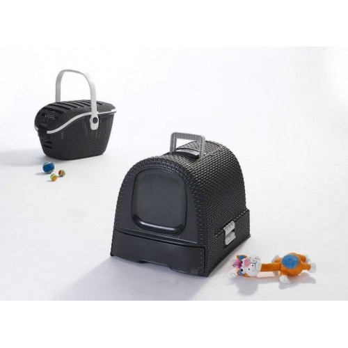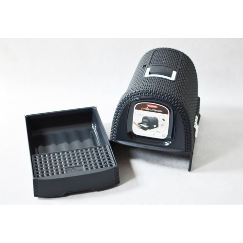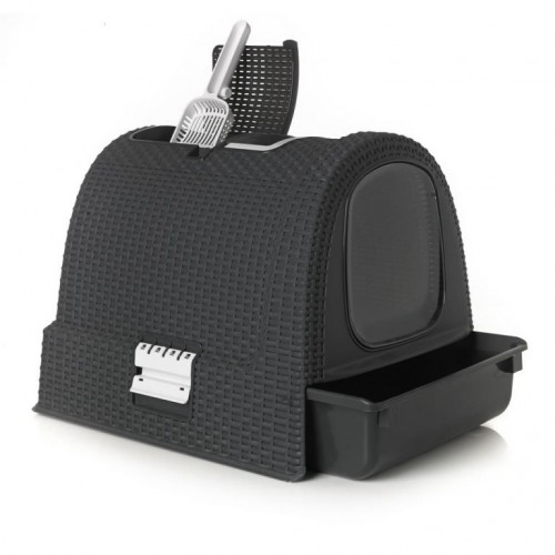 Elegantní toaleta pro kočky (šedé barvy), toaleta tak nepůsobí rušivě v interiéru.Krásný design v ratanovém stylu.Boční klipy pro jednoduché otevření při čištění, výsuvná spodní zásuvka na podestýlku.Dvířka jsou výklopná a v horní části toalety je filtr, který zachytí zápach.Součástí je lopatka na čištění steliva a předložka.Snadno se přenáší díky rukojeti.