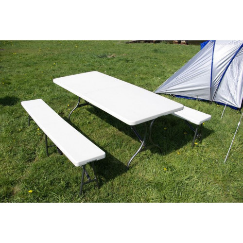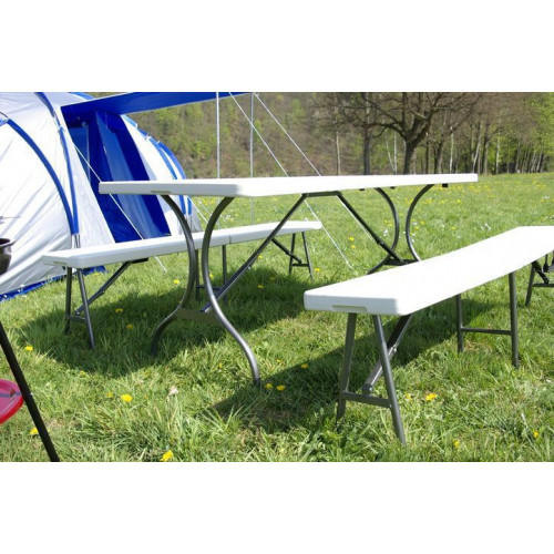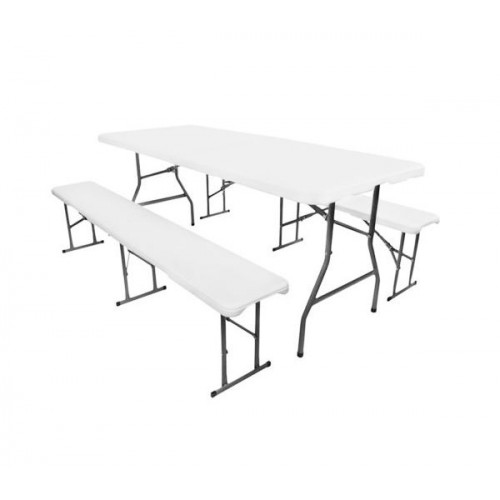 Záhradný set v kombinácii kovu a tvrdého plastu. Veľmi pekný, stabilný a odolný záhradný stôl s 2 lavicami pre 6 - 8 osôb. Stôl a lavice sú skladacie, je možné ich preto ľahko prepravovať a skladovať. Tento set nábytku môžete použiť na akékoľvek oslavy, na terasu, záhradu alebo pri kempovaní.