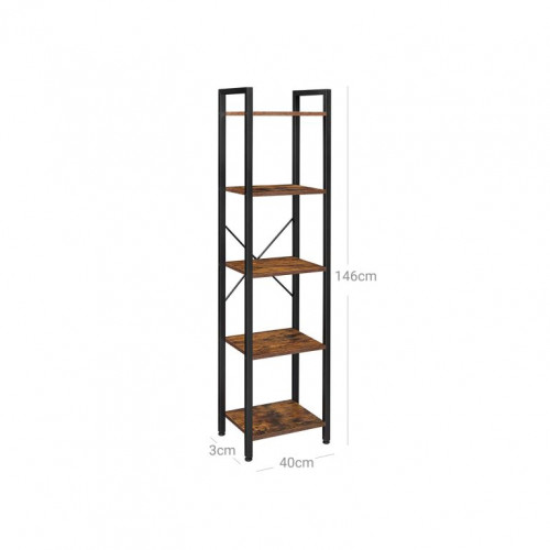 Elegantná knižnica v industriálnom štýle vnesie do vášho domova poriadok aj osobitý šarm. Vďaka piatim otvoreným policam ponúka priestor na knihy, dekorácie, rastliny alebo pracovné pomôcky. Kombinácia čierneho oceľového rámu a rustikálne hnedých dosiek pôsobí štýlovo, moderne a zároveň útulne. Hodí sa do obývacej izby, pracovne, spálne aj chodby.