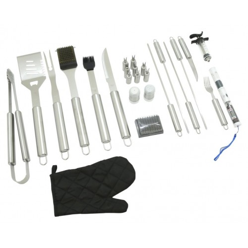 Sada obsahuje všetky nástroje na prípravu a konzumáciu najrôznejších pokrmov, ale aj následnú údržbu grilu. Všetky nástroje sú navyše kvalitne spracované z nerezovej ocele. Okrem iného je súčasťou sady aj injekcia pre aplikáciu marinády do mäsa a praktický teplomer s nerezovou sondou na overenie prevedenia mäsa s rozsahom merania -50 - 300 °C. O napájanie teplomera sa stará 1x batéria LR44 (1,5V). Sada je úhľadne umiestnená v textilnej taške a hodí sa pre tých najnáročnejších vyznávačov dobrého jedla. Výpočet jednotlivých nástrojov ocení ktokoľvek. Sada je primárne určená na využitie doma na záhrade, avšak užitočná je aj na cestách.