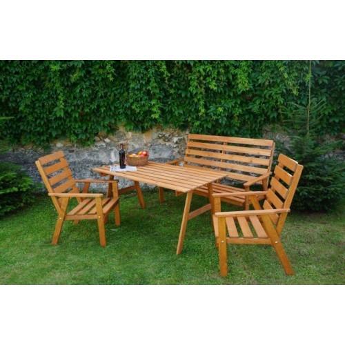 Zahradní set z borovicového dřeva. Set se skládá z lavice, dvou křesel a stolu.