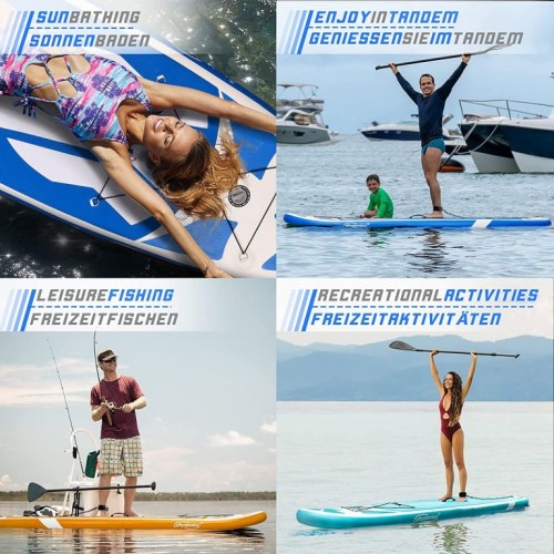 Mimoriadne silný všestranný paddleboard ponúka zvýšenú stabilitu a možno ho použiť aj na túry pozdĺž pobrežia, cvičenie jogy alebo intenzívny tréningový program. Pýši sa veľkým úložným priestorom, trojitou spodnou doskou pre plutvy, D-krúžkom s pásikmi na členky, praktickou rukoväťou a protišmykovou, mäkkou penovou doskou EVA so širokým (80 cm) stojanom. Na rozdiel od mnohých iných modelov na trhu má tento paddleboard iSUP ventil umiestnený vo vnútri úložného priestoru, takže Váš pohyb po ňom je bez prekážok. Je vyrobený z PVC vystuženého technológiou drop stitch, ktorá zaručuje trvanlivosť a odolnosť paddleboardu.
