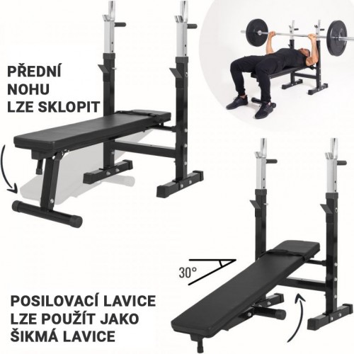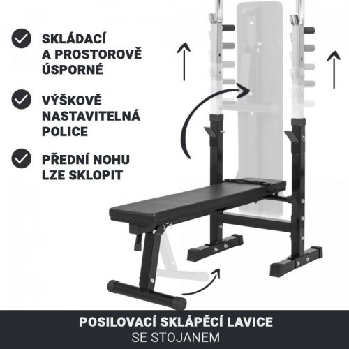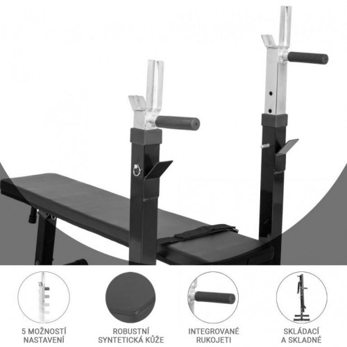 Pevná oceľová konštrukcia s pogumovanými nožičkami zaručuje stabilitu aj pri vyššej záťaži. Stojan na činky je výškovo nastaviteľný v 5 úrovniach (92–112 cm), lavica má nosnosť až 200 kg. Povrch lavice je ľahko udržiavateľný a odolný voči opotrebeniu. Praktické skladanie šetrí miesto, keď lavicu nepoužívate.