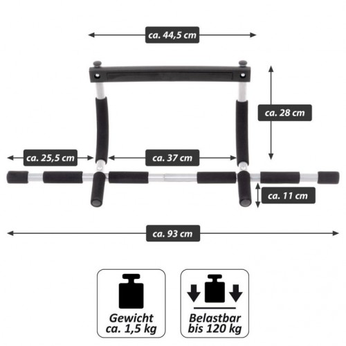 Robustná oceľová konštrukcia zaručuje stabilitu a bezpečnosť pri každom použití. Jednoduchá montáž bez náradia umožňuje rýchle nastavenie výšky podľa vašich potrieb. Gumové koncovky chránia rám dverí pred poškriabaním a zaisťujú pevné uchytenie. Hrazda je vhodná na zhyby, dipy, sklapovačky aj zdvihy nôh.