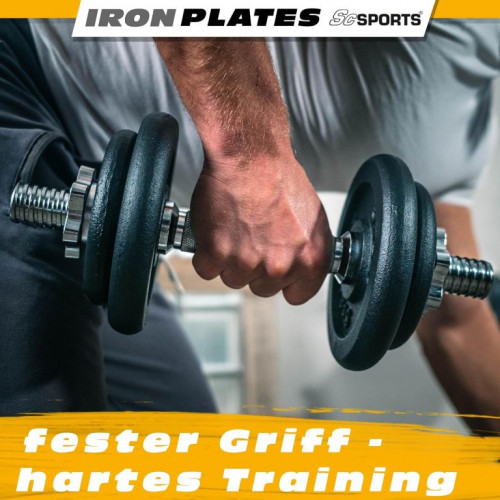 Sada činiek s praktickým kufrom z odolnej umelej hmoty. Krátke činkové hriadele s priemerom 30 mm a činkové kotúče s priemerom 30/31 mm do seba perfektne zapadajú a zabraňujú tak pošmyknutiu alebo búchaniu počas cvičenia.