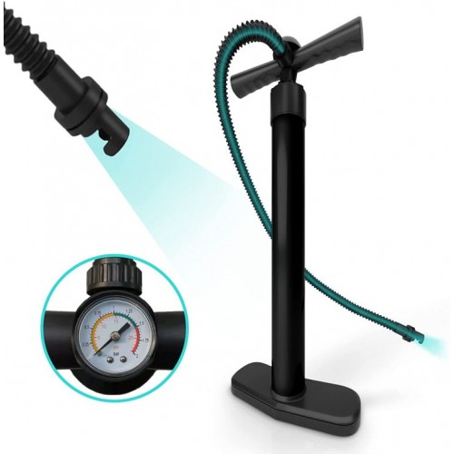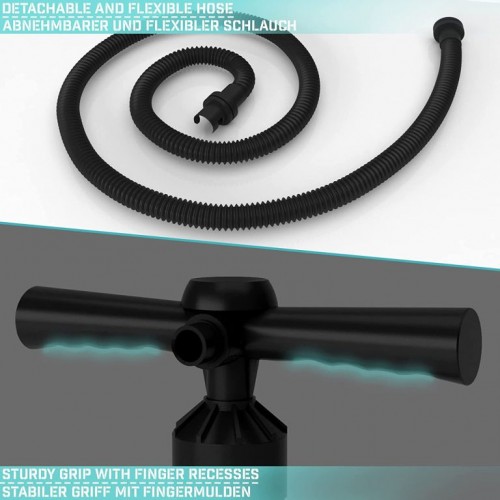 Pokiaľ sa radi zahrejete pred voľnočasovými aktivitami, je táto stojacia pumpa ideálnym fitness prístrojom pred začiatkom pádlovania. Vybavený manometrom, ktorý dosahuje až 25 psi, môžete s touto vzduchovou pumpou nafúknuť všetky bežné Paddleboardy. Manometer stojacej pumpy sa nachádza na hornej strane rukoväte a je tak dobre čitateľný. Robustná rukoväť a nožná doska pre stabilné čerpadlá, nízka hmotnosť a veľkosť nezaberie takmer žiadne miesto a vďaka tomu sa táto vzduchová pumpa stane praktickým doplnkom, ktorý môžete zobrať so sebou na každú cestu.