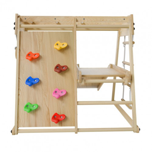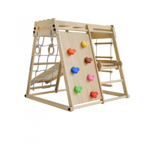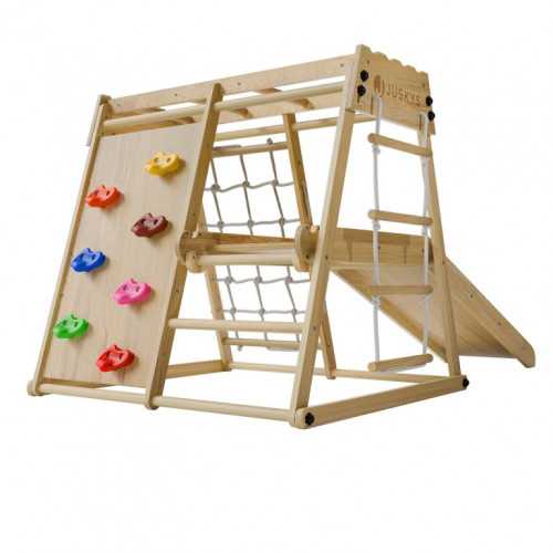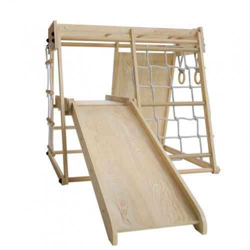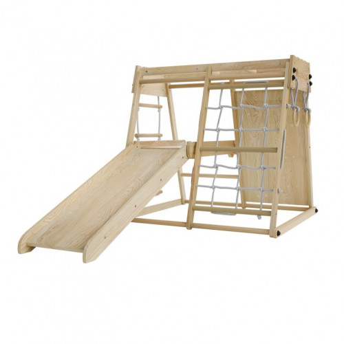 Každá detská izba sa môže premeniť na malé domáce ihrisko, kde nie je núdza o pohyb ani fantáziu. Táto drevená preliezačka ponúka deťom veľa možností, ako sa zabaviť - môžu schádzať po šmykľavke, šplhať po lanovej sieti alebo rebríku, hojdať sa na kruhoch a skúšať nové zručnosti. Zábava je tu zároveň prirodzeným spôsobom rozvoja rovnováhy, sily aj obratnosti.
