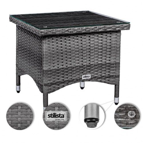 Odkladací stolík vrátane sklenenej dosky je vyrobený z ručne tkaného polyratanu. Je ideálny na vnútorné aj vonkajšie použitie, napr. na terasu, záhradu, do zimnej záhrady alebo na balkón, a hodí sa do každého interiéru. Robustná konštrukcia je obalená polyratanovým prútím odolným proti poveternostným vplyvom a UV žiareniu. Vďaka predmontovaným skrutkám je možné stolík veľmi ľahko vyrovnať pri nerovnostiach podlahy.
