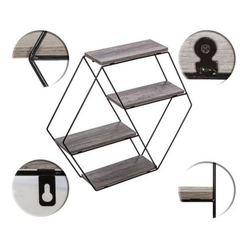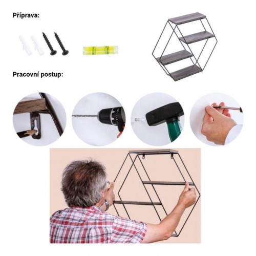 Nástenná dizajnová polička "hexagon" je testovaná drevovláknitá doska MDF podľa štandardnej dyhy E1. Kompletná polica je testovaná na škodlivé látky. Vďaka jednoduchému rámu možno závesnú policu dokonale kombinovať s ďalším nábytkom.