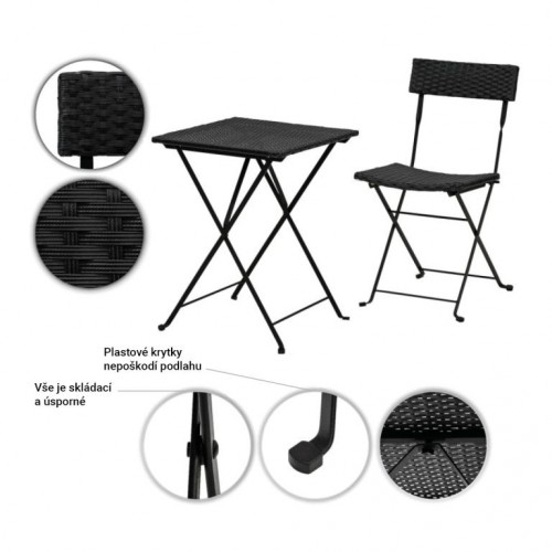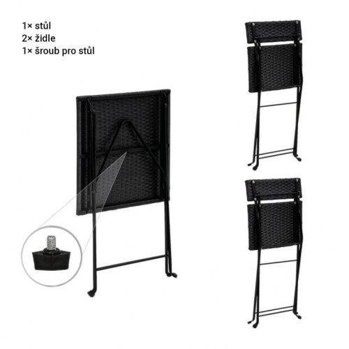 Bistro set skladajúci sa zo záhradného stola a dvoch záhradných stoličiek je vyrobený z ručne tkaného polyratanového prútia s práškovo lakovaným oceľovým rámom. Naša súprava nábytku je vhodná na terasu, záhradu alebo balkón a ponúka dostatok miesta až pre 2 osoby. Záhradné stoličky a stôl je možné ľahko zložiť v niekoľkých jednoduchých krokoch, čo umožňuje priestorovo úsporné skladovanie celej balkónovej súpravy. Praktické na zimné mesiace. Vďaka povrchu odpudzujúcemu nečistoty sa sedacia súprava ľahko čistí a je ideálna na vonkajšie použitie.