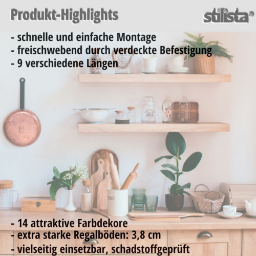 Moderní nástěnné police značky Stilista® produktové řady VOLATO se stanou díky levitujícímu efektu nádherným doplňkem Vašeho pokoje. Police má šířku 3,8 cm a max. nosnost zatížení je 10 kg v závislosti na materiálu zdi, do které polici umístíte.