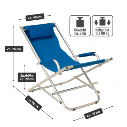 Skladacie piknikové kreslo, ktoré sa rýchlo postaví a pripraví na použitie a rovnako rýchlo zase zbalí. Rám stoličky je vyrobený zo šedého lakovaného hliníka a modrého PVC poťahu. Materiál je mäkký a prispôsobí sa kontúram vášho tela. PVC tkanina záhradnej stoličky je vodoodpudivá a udrží až 110 kg. Hliníkový rám je stabilný a má protišmykové nožičky s profilmi. Vďaka tomu je skladacia stolička ideálnym spoločníkom na záhradu, terasu, pláž, piknik, festivaly, rybárčenie a kempovanie. Skladacie stoličky ponúkajú maximálnu flexibilitu, sú praktické, pohodlné, stabilné, robustné, odolné proti poveternostným vplyvom, ľahké a šikovné. Sú to často používané kusy nábytku na záhradách a na terasách, najmä v lete. Všimnite si tiež naše ďalšie letné/záhradné predmety, ako sú stohovacie stoličky, záhradné stoly, lavičky, slnečníky, stojany na dáždniky, stoličky vyrobené z najrôznejších materiálov av rôznych veľkostiach a farbách.
