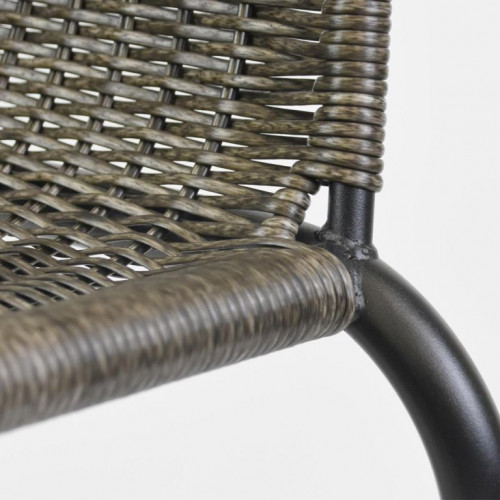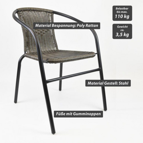 Bistro stolička pre pravú stredomorskú atmosféru v štýle francúzskych kaviarní a bistier je ľahkým a vkusným kúskom na posedenie. Niekoľko stoličiek tohto typu môžete naskladať na seba a ušetriť tak veľa miesta, pokiaľ chcete stoličku odložiť a uložiť ju na zimné mesiace. Použité materiály pri tejto stoličke sú nenáročné na údržbu, odolné vplyvu počasia a nevyžadujú špeciálne prostriedky na ošetrenie. Ľahká a napriek tomu robustná stohovateľná stolička s komfortnou ratanovou sedacou plochou je veľmi pohodlná. Oceľová konštrukcia je ošetrená práškovým povrchom a nohy majú gumové krytky, ktoré zabraňujú pošmyknutiu, tlmia hluk pri pohybe a chránia podlahu. Polyrattan je vyrobený z plastu, je odolný proti roztrhnutiu a zaujímavo tkaný. Skombinujte tieto stohovacie stoličky so zodpovedajúcimi malými okrúhlymi bistro stolíkmi dostupnými v našom obchode. Týmto spôsobom si môžete nakonfigurovať svoj vlastný bistro set.