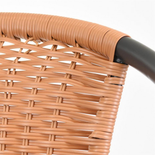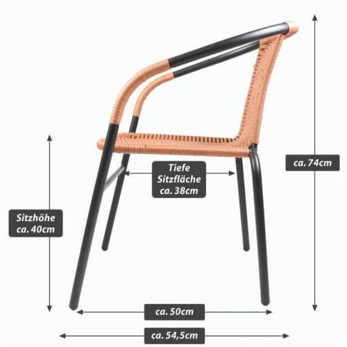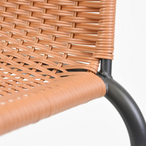 Použité materiály pri tejto stoličke sú nenáročné na údržbu, odolné vplyvu počasia a nevyžadujú špeciálne prostriedky na ošetrenie. Ľahká a napriek tomu robustná stohovateľná stolička s komfortnou ratanovou sedacou plochou je veľmi pohodlná. Oceľová konštrukcia je ošetrená práškovým povrchom a nohy majú gumové krytky, ktoré zabraňujú pošmyknutiu, tlmia hluk pri pohybe a chránia podlahu. Polyrattan je vyrobený z plastu, je odolný proti roztrhnutiu a zaujímavo tkaný. Skombinujte tieto stohovacie stoličky so zodpovedajúcimi malými okrúhlymi bistro stolíkmi dostupnými v našom obchode. Týmto spôsobom si môžete nakonfigurovať svoj vlastný bistro set.