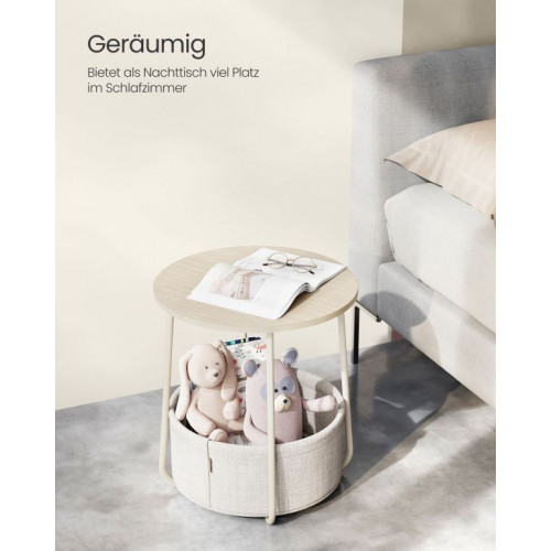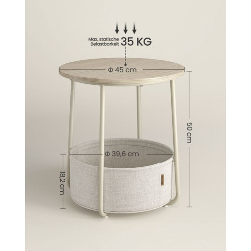 Vneste do svojho domova sviežosť a poriadok s týmto kompaktným okrúhlym stolíkom. Praktický látkový kôš ponúka úložný priestor na všetko potrebné bez toho, aby zaberal miesto. Krémovo biely odtieň sa hodí do každého štýlu interiéru.