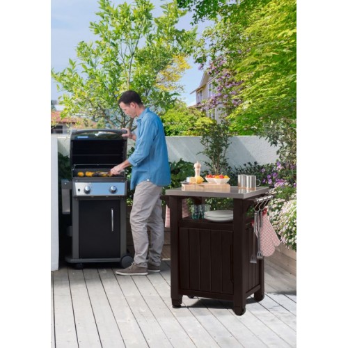 Mobilná skrinka, ktorú oceníte predovšetkým pri grilovaní! Priestranná skriňa s dvojitými dverami vybavená funkčnou nerezovou doskou a praktickou rukoväťou s háčikom na uteráky, ktorá bude dobre fungovať pri dôležitých rodinných stretnutiach na terase alebo na záhrade.