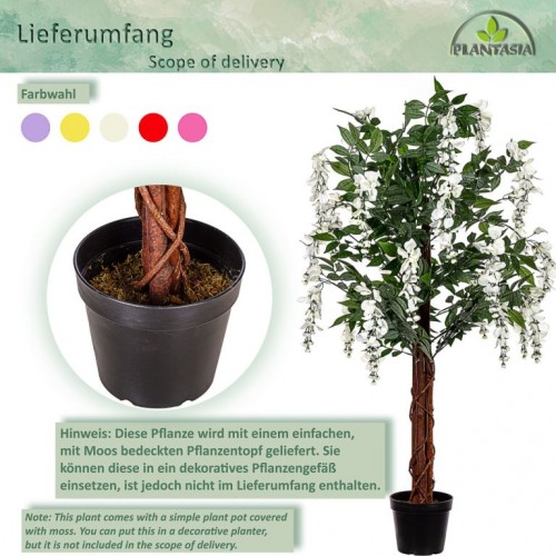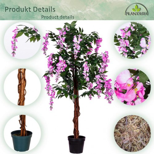 Umelý strom má autenticky zakorenený kmeň s približne 756 listami a 24 kvetnými cípmi. Vďaka detailne prepracovaným listom a kvetom vyzerá umelý stromček mimoriadne realisticky a od skutočného ho možno len ťažko rozoznať. Skutočný drevený kmeň z palmového dreva dotvára realistický vzhľad vistérie. Náš umelý stromček sa dodáva v čiernom kvetináči s Ø 18 x v 17 cm, ktorý je možné ľahko umiestniť do ozdobného kvetináča podľa Vášho výberu. Umelé rastliny nepotrebujú svetlo ani vodu a je možné ich použiť aj v miestnostiach, kam nemožno umiestniť skutočné rastliny.