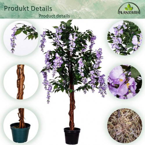 Umelý strom má autenticky zakorenený kmeň s približne 945 listami a 30 kvetnými cípmi. Vďaka detailne prepracovaným listom a kvetom vyzerá umelý stromček mimoriadne realisticky a od skutočného ho možno len ťažko rozoznať. Skutočný drevený kmeň z palmového dreva dotvára realistický vzhľad vistérie. Náš umelý stromček sa dodáva v čiernom kvetináči s Ø 18 x v 17 cm, ktorý je možné ľahko umiestniť do ozdobného kvetináča podľa Vášho výberu. Umelé rastliny nepotrebujú svetlo ani vodu a je možné ich použiť aj v miestnostiach, kam nemožno umiestniť skutočné rastliny.