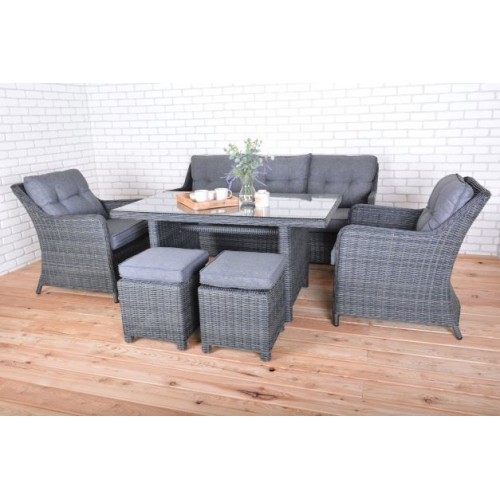 Najnovším módnym trendom nielen v oblasti záhradného nábytku, ale aj interiérového, je nábytok z umelého ratanu. Aj keď sa umelý ratan podobá prírodnému, je oveľa odolnejší. Všeobecne možno povedať, že je pružnejší a je menej pravdepodobné, že sa poškodí. Umelý záhradný ratanový nábytok vyniká ľahkou údržbou a veľkou odolnosťou voči nepriazni počasia. Poťahy sú odnímateľné. Umelý ratanový nábytok sa nelúpe, nevznikajú na ňom nevzhľadné praskliny, je stálofarebný po mnoho rokov. Ak nechcete mať obývačku ladenú v rovnakom duchu ako ostatní, ratanový nábytok je možným riešením ako sa odlíšiť. Luxusný polyratanový nábytok má naozaj veľmi široké využitie. Je vhodný pre vnútorné aj vonkajšie priestory, záhrady, terasy, zimné záhrady, balkóny, kancelárie, rokovacie miestnosti, recepcie a ďalšie komerčné aj bytové priestory. Nemusíte nič skladať ani montovať - nábytok je už pripravený na okamžité použitie. Nábytok z umelého ratanu je funkčný, variabilný, je zábavné s ním žiť a užívať si ho. Luxusná súprava z kvalitného umelého ratanu, ktorý odoláva UV žiareniu a teplote od + 50 °C do -10 °C.Kostra je hliníková + prášková farba. Ratan: 6,5 mm polguľatý. Doska stola: 5 mm tvrdené sklo. Podušky: výplň - 10 cm molitan, látka - 230 g/m2 polyester - spodné podsedáky sú vybavené zipsom, čo umožňuje ľahké pranie povlaku.