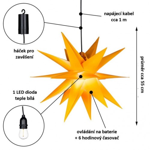 Vianočná dekorácia - hviezda s časovačom 1 LED, 55 cm, žltá