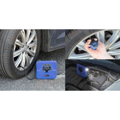 Adaptéry sú vhodné na hustenie lôpt, matracov alebo bazénov. Balenie obsahuje 4 x náhradnú čiapočku k ventilu Auto stop - táto funkcia zaisťuje, že kompresor nahustí pneumatiku na vopred nastavený tlak a následne automaticky kompresor vypne. Vstavaný odnímateľný pneumerač zobrazuje nameraný tlak v niekoľkých rôznych jednotkách. Vstavané svietidlo 9 x LED je vhodné na osvetlenie pracovného priestoru. Pred použitím si dôkladne prečítajte priložený návod.