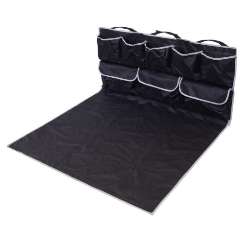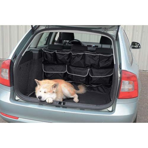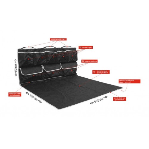 Ochranná deka do kufra auta má jedinečnú konštrukciu, ktorá chráni dno i zadnú časť batožinového priestoru a navyše je vybavená celým radom praktických vreciek, a to vrátane uzatvárateľných. Ideálne na prepravu psa alebo znečisteného nákladu v batožinovom priestore. Zároveň pomáha udržiavať poriadok tým, že veľa drobností možno umiestniť do vreciek. Jedná sa o univerzálnu veľkosť, upevní sa jednoducho zaháknutím za opierky hlavy na zadných sedadlách, spodná strana potom vďaka suchému zipsu výborne drží. Vyrobené z impregnovaného materiálu, ktorý možno jednoducho očistiť vlhkou handričkou alebo hubou za pomoci bežného saponátu.