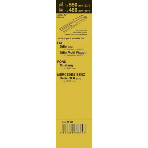 Dĺžky stieračov a systém uchytenia na ramienko sú prispôsobené vybraným vozidlám (viď tabuľka použitia). Vysoko kvalitný pružný člen plochého stierača zaisťuje rovnomerný tlak grafitového britu v celej jeho dĺžke, čo zamedzuje rozmazávaniu nečistôt a vytváraniu pruhov.