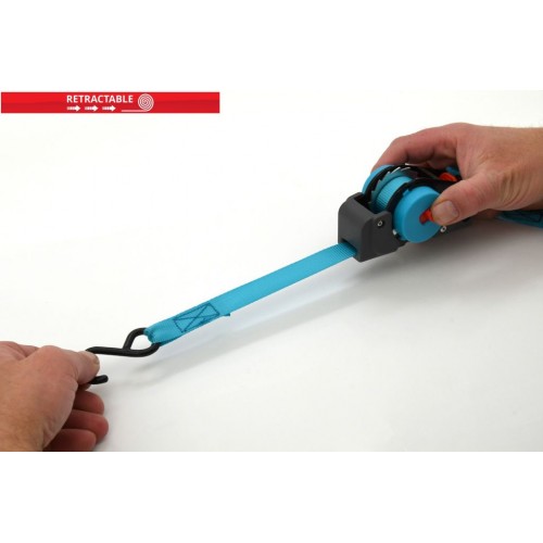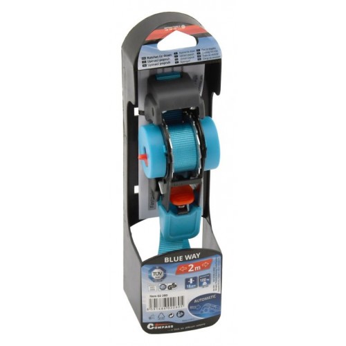 Samonavíjací upínací popruh na zabezpečenie predmetov, batožiny alebo nákladu. Na upnutie sa využíva celokovová račňa s istiacim mechanizmom. Račňa je navyše opatrená samonavíjaním, ktorý po stlačení tlačidla navíja späť popruh po celej dĺžke. Konce popruhov sú osadené kovovými hákmi s povrchom z tvrdeného plastu.