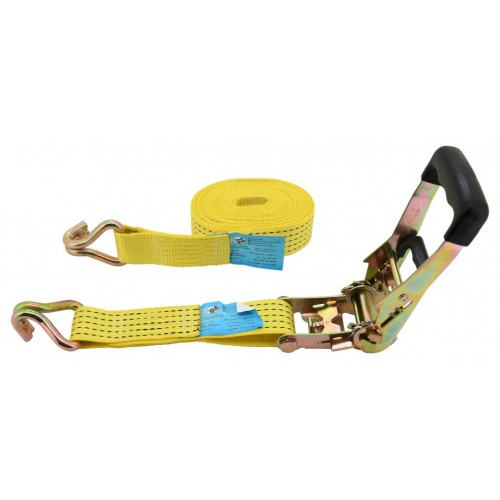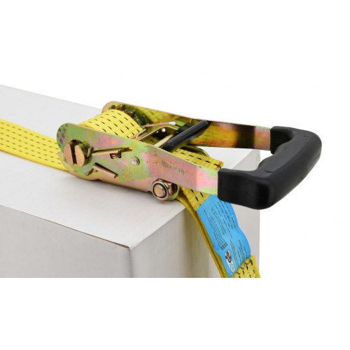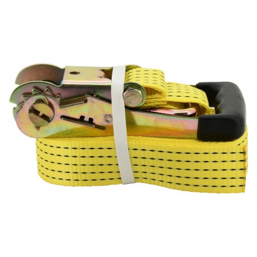 Upínací račňový popruh s kovovými hákmi, s homologáciou TÜV / GS, na zaistenie ťažkého nákladu. Račňa je celokovového prevedenia s odolným istiacim mechanizmom, opatreným plastovým madlom pre pohodlnú manipuláciu a ovládanie. Popruh šírky 50 mm s dĺžkou 8 m sa vyznačuje pevnosťou v ťahu 5000 kg (po obopnutí nákladu). Pri upínaní nákladu odporúčame používať plastové rohy alebo ochranné návleky. Bez použitia ochranných návlekov, alebo rohov, dochádza k zníženiu pevnosti upínacích pásov ak opotrebovaniu popruhu.