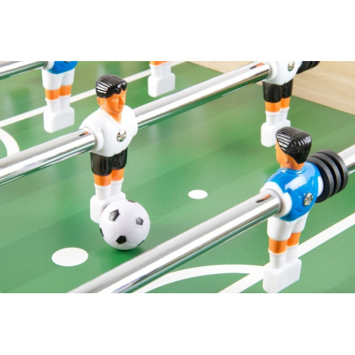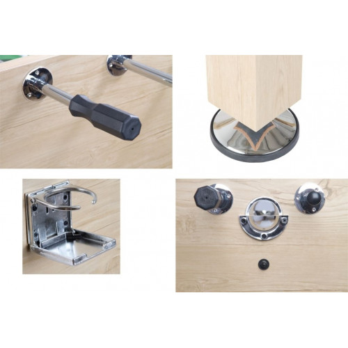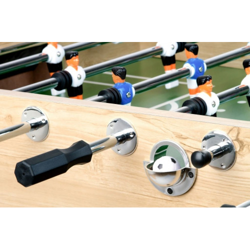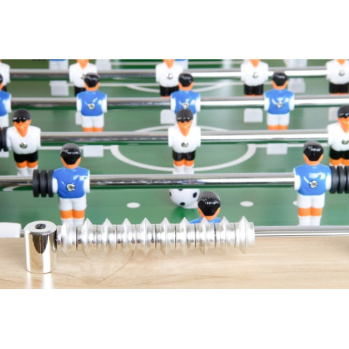 Kvalitný stolný futbal, ktorý vás nadchne už porovnaním kvality a ceny. Tento futbal má telo vyrobené z MDF a je vybavený štyrmi výškovo nastaviteľnými oceľovými nohami (s chrómovým vzhľadom a gumovými nožičkami na ochranu podlahy). Výhodou tohto futbalu sú tiež držiaky nápojov, protišmykové rukoväte pre pohodlnejšiu hru, maľované figúrky na naskrutkovanie a skosené rohy, ktoré zabránia uviaznutiu loptičky. Stôl je dodávaný rozmontovaný, ale jeho montáž je veľmi rýchla a jednoduchá. Hrany sú v chrómovom prevedení.