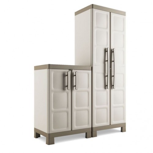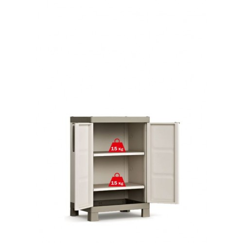 Nízka plastová skriňa LOW obsahuje 2 poličky, z ktorých každá unesie 15 kg. Vznikajú tak tri úložné priestory vhodné na skladovanie uterákov, oblečenia, saponátov, ale aj kancelárskych a iných potrieb. Vďaka vybaveniu umožňujúcemu skriňu zamknúť na visací zámok sa Excellence LOW hodí aj do spoločných priestorov klubov, recepcií a učební.