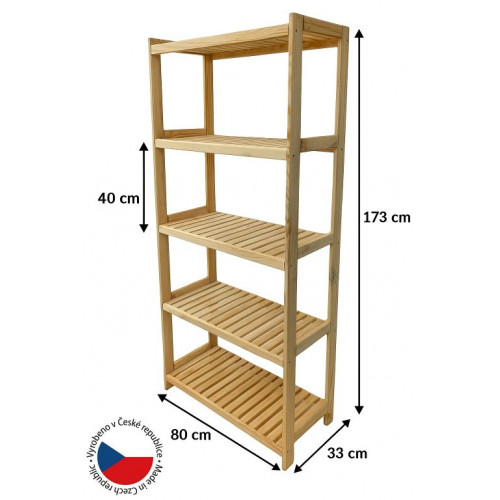 Regál ponúka päť priestranných políc s nosnosťou až 25 kg na každú z nich. Dodáva sa v rozloženom stave, ale vďaka premyslenej konštrukcii ho zložíte ľahko bez použitia náradia. Povrch nie je nijako upravený, takže si ho môžete prispôsobiť podľa vlastného vkusu alebo zachovať krásny surový vzhľad českého dreva.