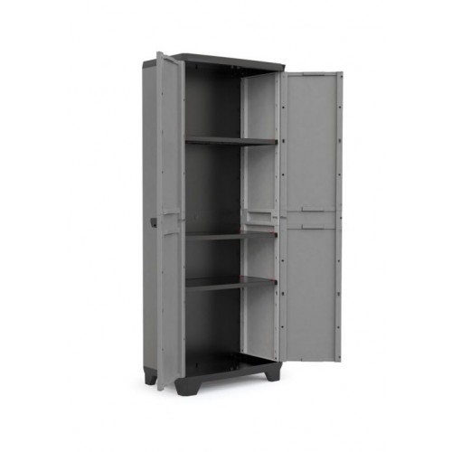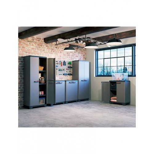 Veľká plastová policová skriňa s nosnosťou 15 kg na policu sa ideálne hodí na umiestnenie v dielňach, šatniach, na verandách alebo v garážiach. Je veľmi praktickým pomocníkom na organizáciu rôznych vecí. V skrini nájdete tri police, ktoré môžete variabilne umiestniť. Nosnosť každej z nich je maximálne 15 kg. Montáž skrine s policami zaberie približne desať minút. Skriňa je vybavená pevným očkom na pripevnenie visiaceho zámku.