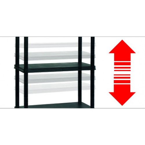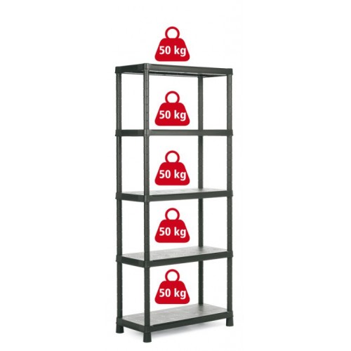 Skladový plastový regál PLUS 80/5 si môžete prispôsobiť podľa svojich potrieb vďaka posunovateľným policiam s nosnosťou 50 kg. Regál s 5 policami si môžete aj priskrutkovať k stene (súčiastky v balení) a vďaka spojovaciemu systému k nemu pripevniť ďalšie regály z rady PLUS. - každá z 5 poličiek unesie až 50 kg. Jednoduchá montáž bez potreby náradia, regály sa medzi sebou dajú spájať v pevný regálový systém. Balenie obsahuje aj súčiastky na primontovanie ku stene. Zvýšené nohy umožňujú zametanie podlahy pod regálom. Vhodný do domácnosti, garáží, skladov a pod.