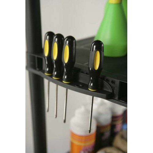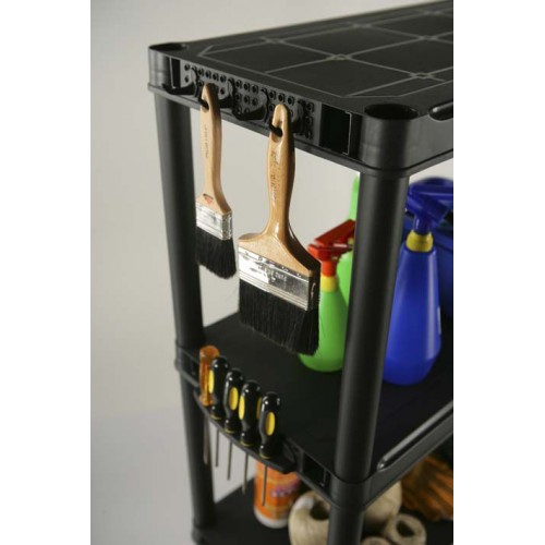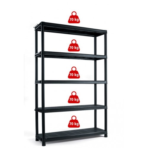Plastový regál široký 120 cm je veľmi vhodný do skladu alebo garáže, ideálny na ťažké náradie. Každá z 5 poličiek unesie až 70 kg a robustnosť celého regálu ešte posilňujú 2 kovové výstuhy. Celková nosnosť regálu 350 kg (70 kg/polica). Jednoduchá montáž bez potreby náradia. 2 kovové výstuhy podporujú pevnosť a odolnosť regálu. Regál môžete pripevniť aj k stene (potrebné súčiastky vo vnútri balenia). Zdvihnuté nohy regálu pre jednoduché zametanie podlahy. Široké police umožňujú uskladňovať aj rozmerné náradie, skladacie stoličky, vysávač apod. Vďaka spojovaciemu systému pevne pripojíte ďalšie regály.
