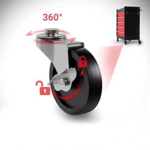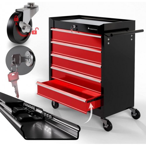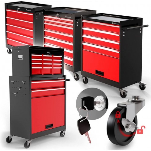 Vozík na náradie bol navrhnutý pre Vaše náradie, ktoré potrebujete mať vždy po ruke, a pomôže Vám udržať poriadok v garáži. Mobilný dielenský vozík je vybavený úložným priestorom a piatimi zásuvkami (s vložkami), ktoré ponúkajú dostatok úložného priestoru pre dôležité dielenské príslušenstvo. Tento montážny vozík má 4 riadiace kolesá, z ktorých 2 majú parkovacie brzdy, takže vozík môžete v garáži voľne premiestňovať, ale aj ho zafixovať na jednom mieste. Integrovaný centrálny zámok uzamkne všetky zásuvky naraz, takže ich počas prepravy nie je možné otvoriť a všetky Vaše veci sú bezpečne uložené v skrini na náradie.