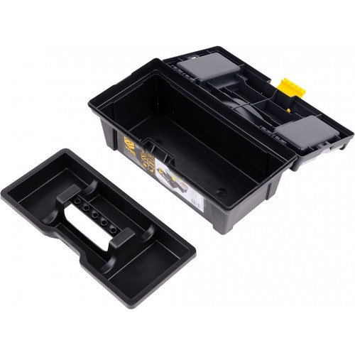 Plastový kufor s dvomi pevnými organizérmi na veku a vyberateľnou vnútornou vložkou na drobné predmety.