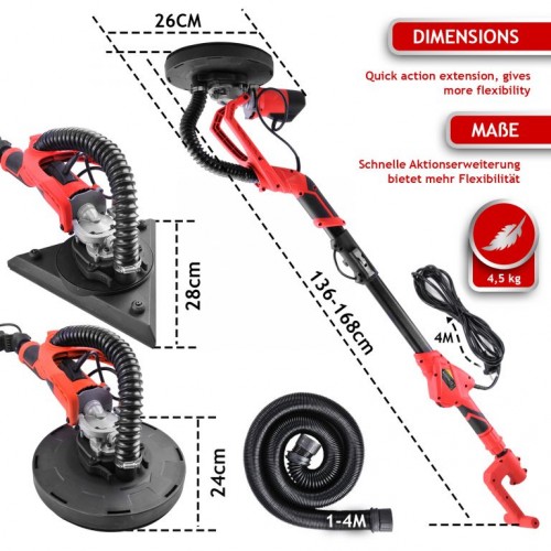 Vysúvacia brúska na sadrokartón je ideálna pre maliarov a štukatérov. Pokiaľ ide o dosiahnutie dokonalých výsledkov, táto stropná brúska Vám ušetrí čas a námahu s premiestňovaním rebríka každých pár minút. Ergonomické ovládanie a vysoký výkon robia z brúsky skvele zvoleného pomocníka. Zároveň získate mnoho doplnkov, takže môžete okamžite začať pracovať. Dvanásť brúsnych kotúčov s rôznymi zrnitosťami sa prispôsobí každej úlohe. Vďaka otočnej hlave sa dostanete aj do tých najťažších rohov, skvelá voľba pre každého profesionálneho majstra.