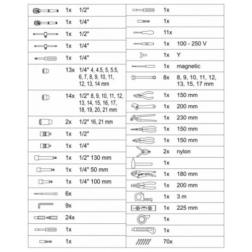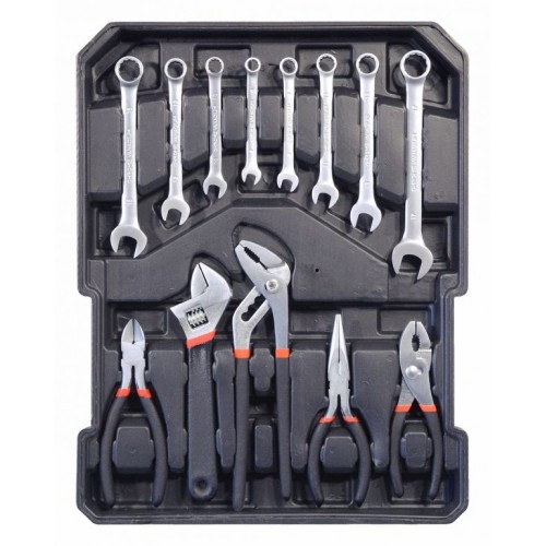Kufrík je vybavený teleskopickým úchytom a kolieskami, vďaka ktorým je manipulácia s celou sadou náradia veľmi jednoduchá. Sada obsahuje celý rad klieští, skrutkovačov, gola kľúčov, kladivo, vodováhu, stranové aj imbus kľúče, bity, základný spojovací materiál a celý rad ďalšieho náradia, ktoré je vhodné pre použitie ako doma, v garáži, tak aj na cestách.