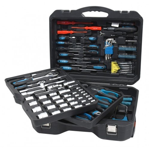 Profesionálny prenosný kufor vybavený kvalitným náradím, vrátane ráčňových kľúčov s veľmi jemným mechanizmom a spojovacím materiálom, prehľadne usporiadaný vo vopred určených pozíciách. Spodné plato obsahuje kladivo, meter, samosvorné a odizolovávacie kliešte, spojovací materiál a ďalšie užitočné vybavenie pre najrôznejšie práce. Vložené plato s najbežnejšie používanými kliešťami a s vysoko kvalitnými, chróm-vanadiovými račňovými kľúčmi s veľmi jemným 72 zubovým chodom. Veko obsahuje izolované, klasické a hodinárske skrutkovače, spolu s imbusovými kľúčmi, koncovkami a pod. Ďalej potom vysoko kvalitné račne, nadstavce, ohybný nadstavec, t-vratidlá a rôzne predlžovacie nadstavce z chróm-vanádiovej ocele umiestnené vo vloženom pláte. Na zadnej strane je kufor vybavený teleskopickou rukoväťou a kolieskami pre jednoduchú manipuláciu.