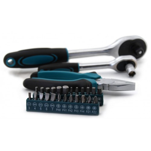 - 24 x bit (plochý, krížový, hviezdička, imbus), 1 x skrutkovač na bity račňový, 3 x skrutkovač izolovaný (2 x plochý, 1 x krížový), 5 x skrutkovač plochý (3 - 6 mm), 6 x skrutkovač krížový (PH0 - PH3), 6 x skrutkovač hodinársky (1.4, 2.0, 2.4, 3.0 mm, # 0, # 1), 9 x imbus kľúč (1.5 - 10 mm), 1 x vyťahovák magnetický teleskopický, 1 x skúšačka 100 - 250 V, 1 x nadstavec na bity (šesťhran), 1 x bit Y na krídlové matice