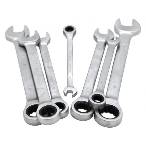 - 1 x kliešte štípacie 160 mm, 1 x nastaviteľný kľúč 200 mm, 1 x kliešte siko 250 mm, 1 x kliešte predĺžené 200 mm, 1 x kliešte kombinované 150 mm, 10 x kľúč očkoplochý račňový (8, 9, 10, 11, 12, 13, 14, 15, 17, 19 mm)