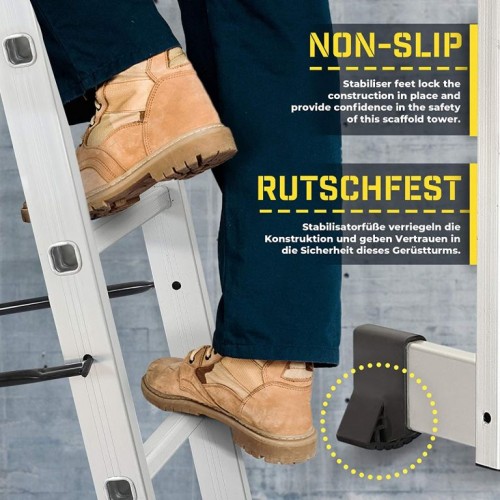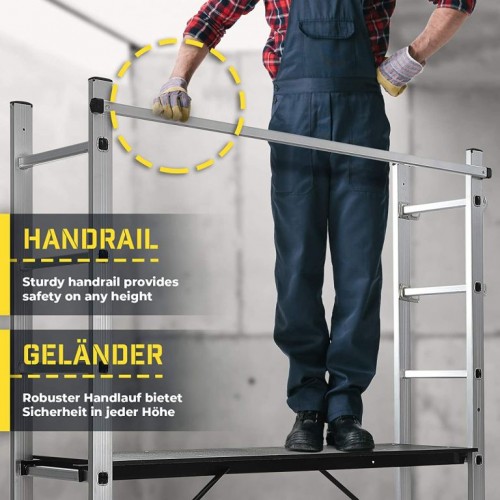 Pre každého majstra alebo milovníka majstrovania je naše lešenie skvelou alternatívou k voľne stojacim rebríkom. Vďaka ľahko nastaviteľnej výške môže slúžiť aj ako pracovný stôl. Dva rebríky, ktoré tvoria boky tejto pracovnej plošiny, možno vybrať a použiť ako samostatné rebríky. Vďaka tomu je skladovanie a preprava veľmi univerzálna. Lešenie má kolieska s nastaviteľnými podperami brzdy, čo znamená, že je možné lešenie posunúť na miesto a zabezpečiť ho v danej polohe. Tento systém lešenia je praktickou a solídnou voľbou pre akýkoľvek projekt nad zemou. Farby sa môžu mierne líšiť od fotografie.