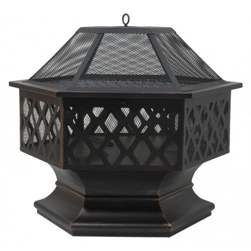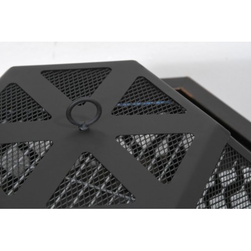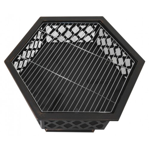 Prenosné ohnisko na drevo HEXAGON so šesťuholníkovou konštrukciou vhodné na terasy a záhrady. Konštrukcia ohniska je vyrobená z kvalitnej ocele s vysokoteplotným čiernym/medeným náterom s patinou. Na grilovanie je ohnisko vybavené oceľovým roštom s rozmermi 61 x 53 cm. Špeciálne tvarovaný poklop s pletivom poslúži ako ochrana pred iskrami, čo výrazne zvyšuje bezpečnosť a pohodlie. Ohnisko je navyše vybavené pevným podstavcom, jeho umiestnenie tak ponúka skrášlenie priestoru.