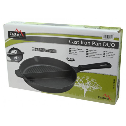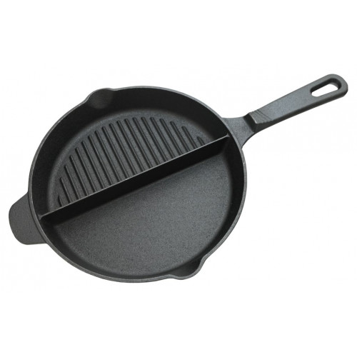 Grilovacia panvica z liatiny priemeru 25 cm s dvoma priestormi na prípravu pokrmov. Panvičku je možné použiť pre grily s bežnou, či liatinovou mriežkou. Liatinová panvica zaistí dokonalé grilovanie steakov a iných pokrmov bez straty drahocenného sosu a šťavy. Vďaka rozdeleniu priestoru na prípravu pokrmov, je možné grilovať súbežne rôzne druhy pokrmov. Bytelná rukoväť uľahčí manipuláciu v žiaruvzdornej rukavici a je opatrená otvorom pre ľahké uchytenie napríklad na háčik odkladacieho priestoru grilu. Pre manipuláciu s panvičkou berte na vedomie jej vysokú teplotu odporúčame použitie žiaruvzdornej rukavice.