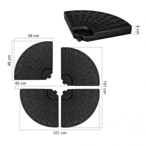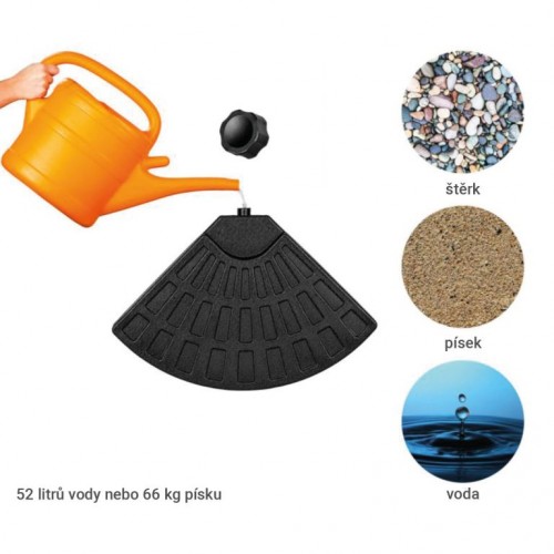 Záťaž na slnečník Stilista sa skladá zo štyroch samostatných závaží na zaistenie slnečníka. Stojan na slnečník je možné naplniť 52 litrami vody alebo 66 kg piesku a zaistiť tak bezpečný stojan pre Váš slnečník. Vďaka delenej konštrukcii môžete záťaž slnečníka rýchlo a priestorovo úsporne uložiť, keď ju nepoužívate. Rukoväte uľahčujú prepravu jednotlivých záťažových prvkov, aj keď sú plné.