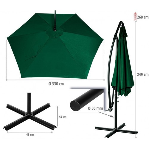Slnečník vrátane poťahu je vyrobený z pevného polyesteru 180 g/m² so stabilnou oceľovou konštrukciou a ponúka mnoho farieb. Náš slnečník je možné pohodlne otvoriť a zavrieť pomocou ručnej kľučky. Optimálny tieň získate vďaka nastaviteľnému uhlu slnečníka a otočnému ramenu do všetkých strán. Slnečník poskytuje ochranu pred slnečnými lúčmi, cirkuláciu vzduchu podporuje integrovaná strieška, ktorá zabraňuje hromadeniu tepla. Vodoodpudivý poťah navyše poskytuje ochranu proti miernemu dažďu.