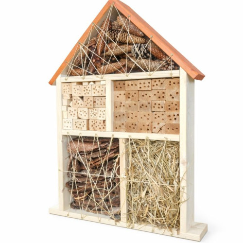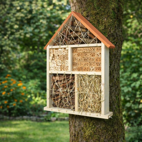 Medzi najčastejších obyvateľov hotelov pre hmyz patria samotárske včely, ktoré patria medzi významných opeľovačov. Okrem samotárskych včiel tu môžu nájsť úkryt aj motýle a lienky, ktorých larvy likvidujú škodlivý hmyz. Ďalší obyvatelia, ako sú zlatoočky, lienky a škrípky, požierajú škodlivý hmyz, predovšetkým vošky. Prečo mať hotel pre hmyz ? Hmyz nám pomáha pri likvidácii škodcov (vošky atď.), najmä ak sa chceme vyhnúť chemickým prípravkom. Ľudia si tiež často neuvedomujú, že bez opeľovačov by sme sa nedočkali veľkej úrody. Väčšina ovocných stromov však potrebuje na opelenie hmyz. Kam umiestniť hotel pre hmyz? Vyššie nad zemou, najlepšie na strom alebo na stenu. Na južnú stranu, kde bude chránený pred dažďom a vetrom. Na väčšiu plochu odporúčame umiestniť viac hotelov.